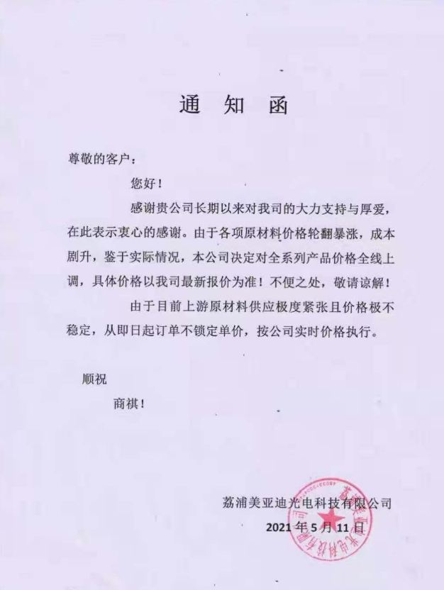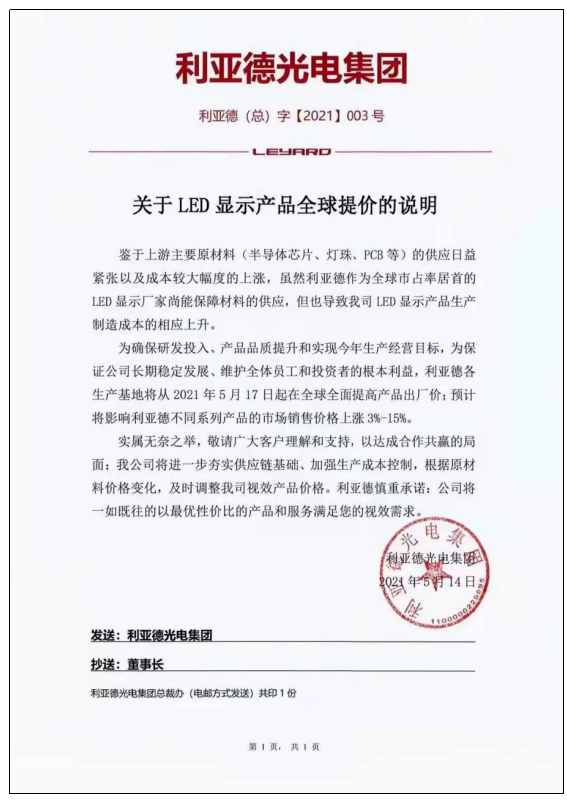 5月17日,利亞德發(fā)布LED顯示產(chǎn)品全球提價通知“鑒于上游主要原材料(半導(dǎo)體芯片、燈珠、PCB等)的供應(yīng)日益緊張以及成本較大幅度的上漲,利亞德將從即日起在全球全面提高產(chǎn)品出廠價?!币皇て鹎永?,頓時在行業(yè)內(nèi)引發(fā)巨大反響。